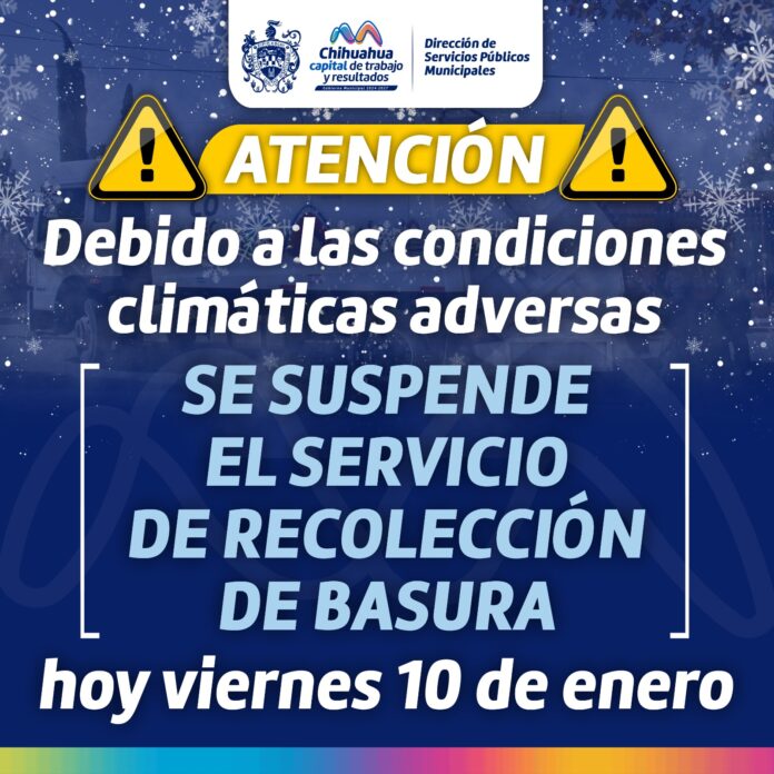 Chihuahua, Chih.- El Gobierno Municipal, a través de la Dirección de Servicios Públicos Municipales, informa a la población en general que el servicio de recolección de residuos se suspenderá este viernes 10 de enero, debido a las inclemencias del tiempo que persisten en la ciudad de Chihuahua.