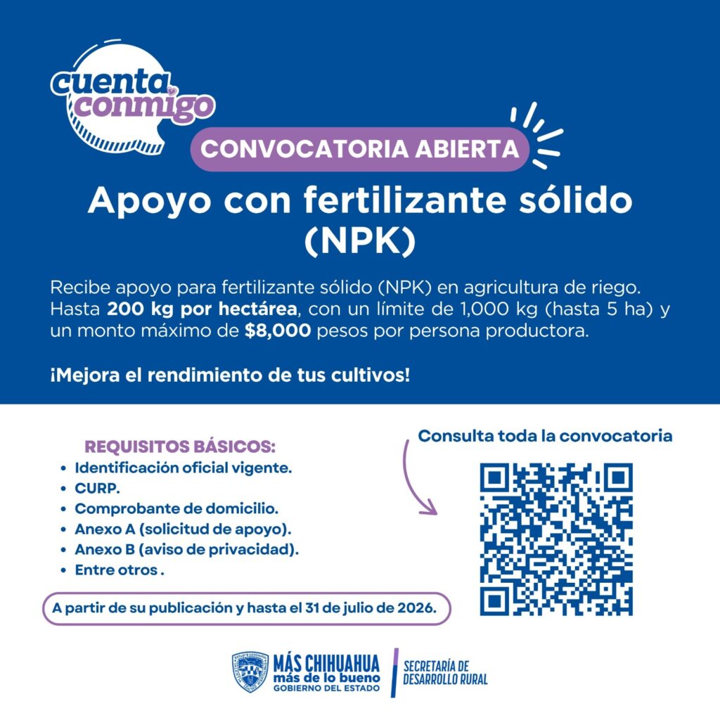 Como parte del esquema de apoyos del programa Cuenta Conmigo en el Campo, la Secretaría de Desarrollo Rural (SDR) informó que ya se encuentra disponible la convocatoria para acceder al apoyo de fertilizante sólido, dirigido a la agricultura de riego.