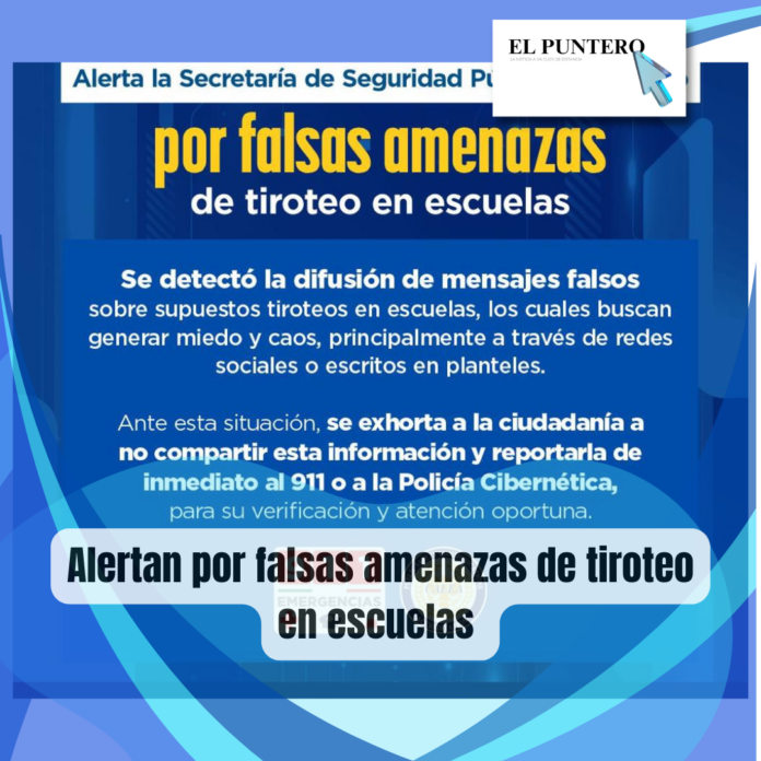 La Secretaría de Seguridad Pública del Estado (SSPE), a través de la Policía Cibernética y sus áreas de Proximidad, informó sobre la detección de diversos casos de presuntas amenazas y mensajes que hacen alusión a posibles tiroteos en escuelas, los cuales han sido difundidos principalmente en redes sociales y en espacios físicos dentro de planteles educativos.