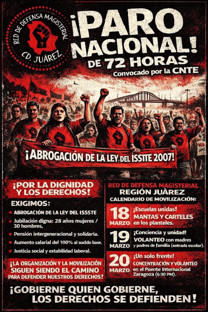 Mientras que el viernes 20 de marzo, a las 6:30 de la tarde, los docentes convocaron a una concentración y volanteo en el Puente Internacional Zaragoza, uno de los principales cruces fronterizos de la ciudad.