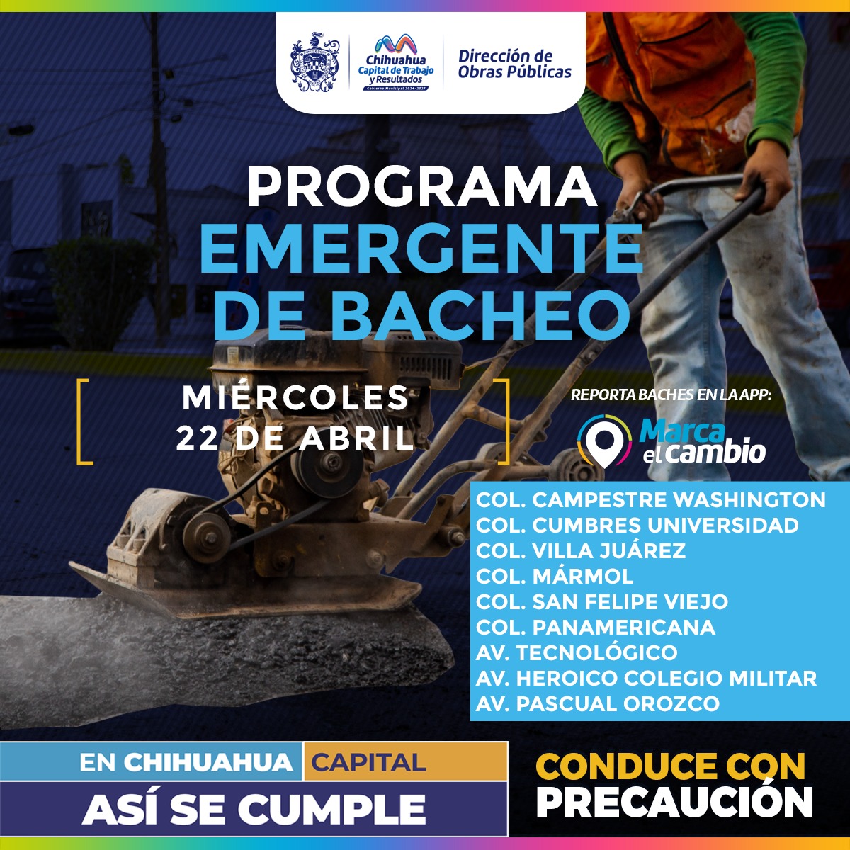 H. Ciudad de Chihuahua, Chih., a 22 de abril de 2026.- El Gobierno Municipal, a través de la Dirección de Obras Públicas, realizará trabajos de bacheo este miércoles 22 de abril mediante el programa emergente en calles de las colonias: Campestre Washington, Cumbres Universidad, Villa Juárez, Mármol, San Felipe Viejo y Panamericana, así como en las avenidas Tecnológico, Heroico Colegio Militar y Pascual Orozco.