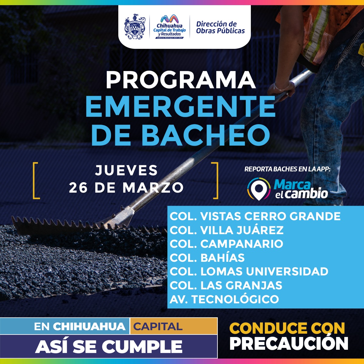 H. Ciudad de Chihuahua, Chih., a 26 de marzo de 2026– El Gobierno Municipal, a través de la Dirección de Obras Públicas, realizará trabajos de bacheo este jueves 26 de marzo mediante el programa emergente en las calles de las colonias: Vistas Cerro Grande, Villa Juárez, Campanario, Bahías, Lomas Universidad y Las Granjas, así como en la avenida Tecnológico.