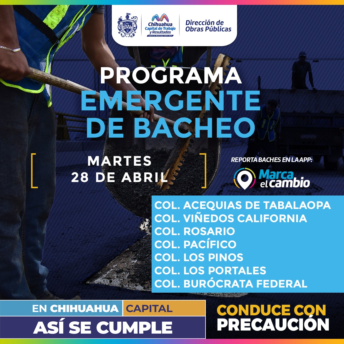 H. Ciudad de Chihuahua, Chih., a 28 de abril de 2026.- El Gobierno Municipal, a través de la Dirección de Obras Públicas, realizará trabajos de bacheo este martes 28 de abril mediante el programa emergente en calles de las colonias: Acequias de Tabalaopa, Viñedos California, Rosario, Pacífico, Los Pinos, Los Portales y Burócrata Federal.