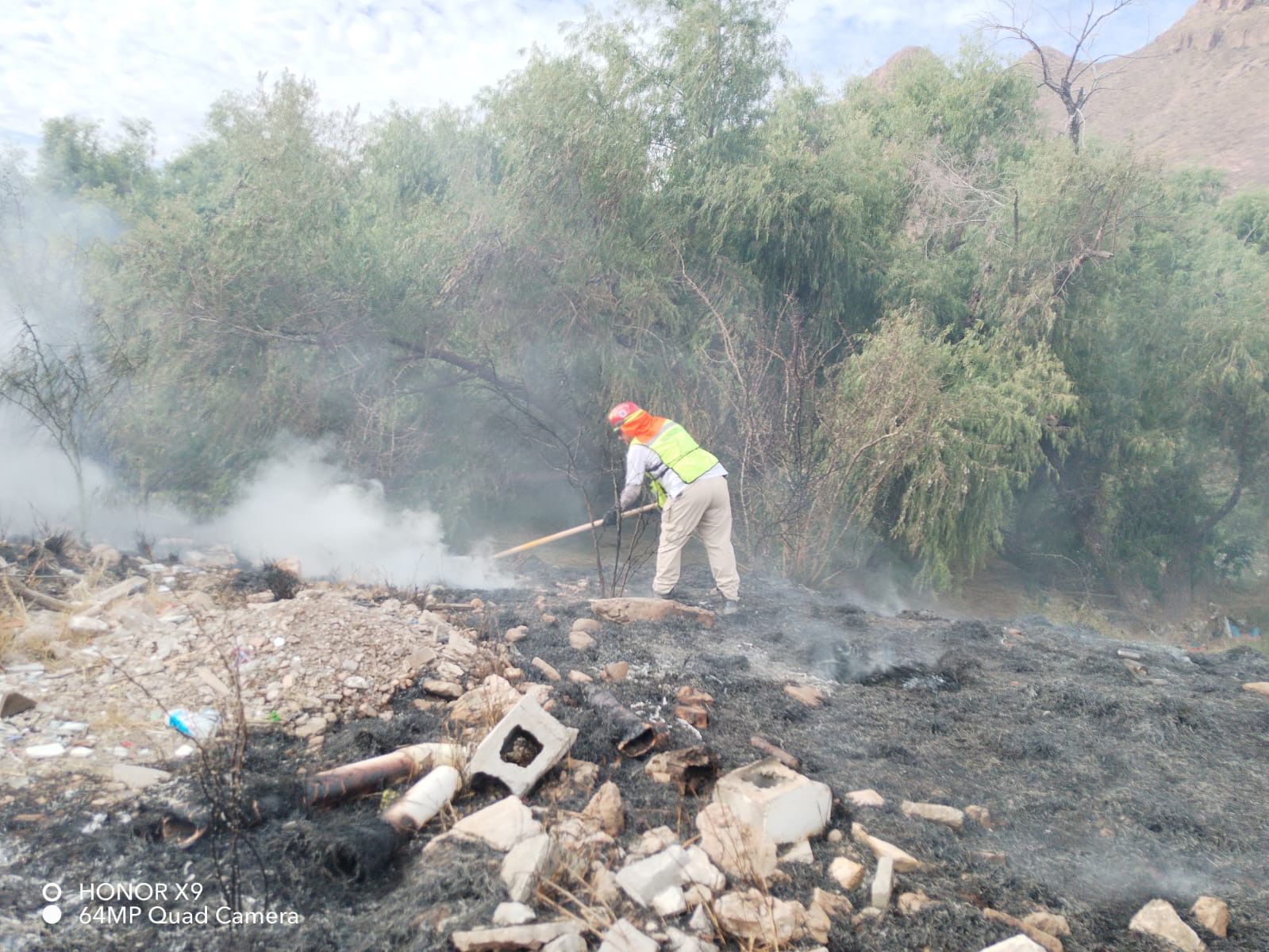 En el lugar se detectó un predio con fuego activo en pastizal y acumulación de basura, principalmente desechos de poda, con una afectación aproximada de una hectárea.