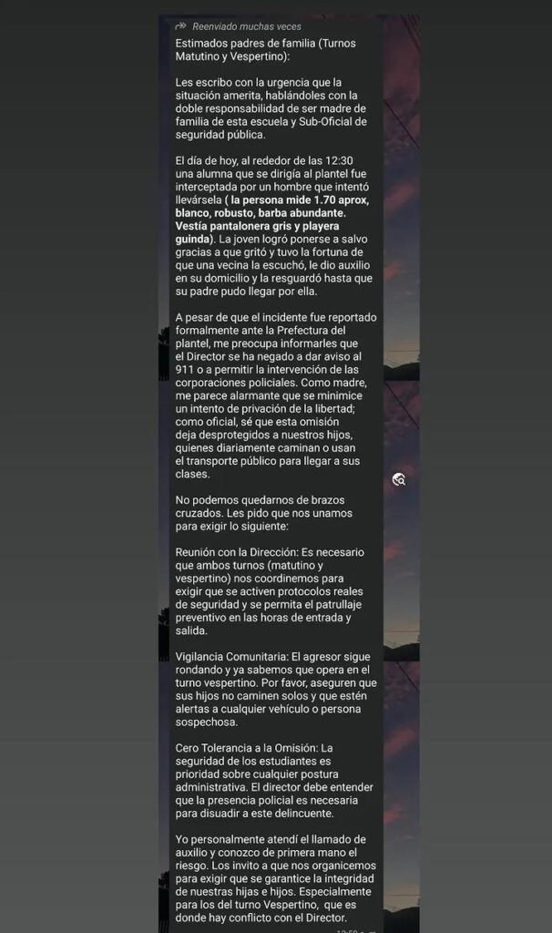 Posteriormente, madres de familia sostuvieron el jueves 16 de abril una reunión de seguimiento con el director del plantel, en la que se acordaron diversas acciones para fortalecer la seguridad en el entorno escolar.
