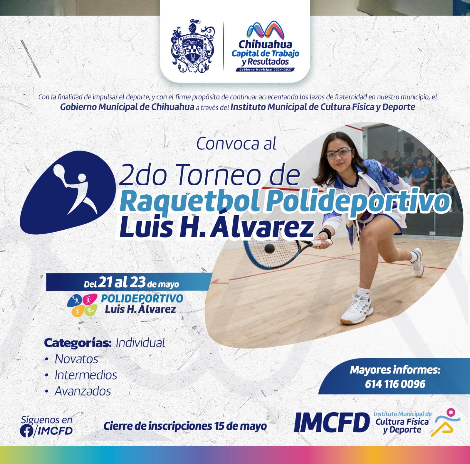 H. Ciudad de Chihuahua, Chih., a 5 de abril de 2026.- Con el objetivo de impulsar el uso, la participación y la apropiación de las canchas del Polideportivo Luis H. Álvarez, el Gobierno Municipal de Chihuahua invita a la ciudadanía a participar en la segunda edición del Torneo de Raquetbol, que se llevará a cabo del 21 al 23 de mayo.