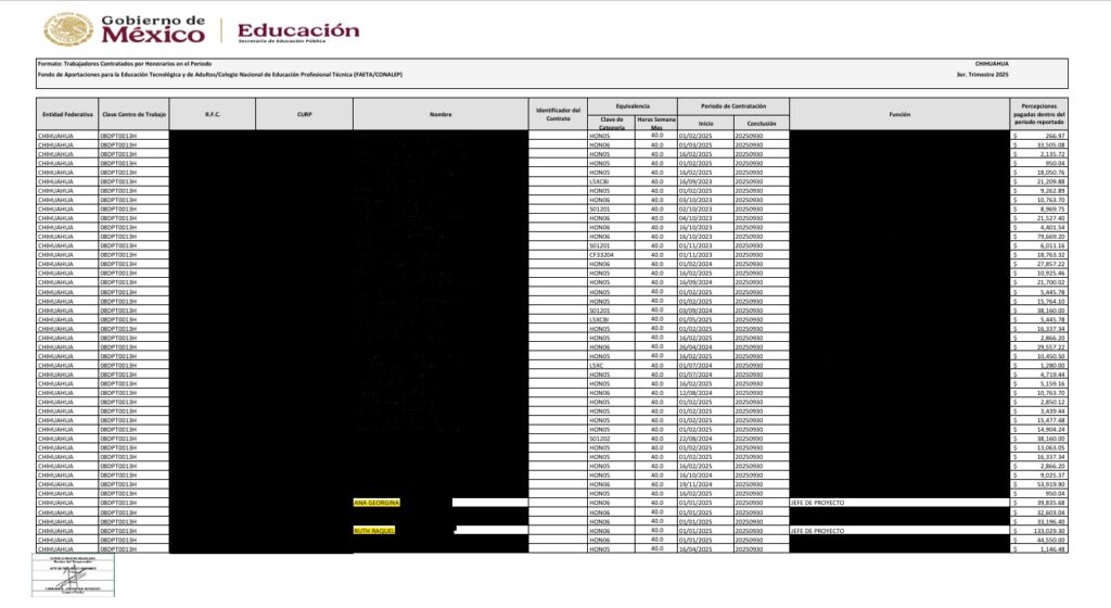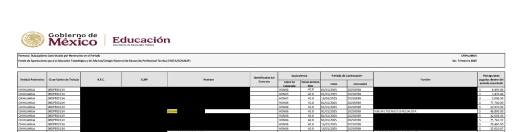 Asimismo, se advierte sobre una posible nómina inflada con perfiles que, presuntamente, no desempeñarían labores sustantivas. En ese contexto, se mencionan casos como el de Ruth Raquel B. O., quien —según los reportes— recibiría ingresos superiores a algunos directivos (por ejemplo el del Conalep Juárez III) sin acudir a laborar, así como el de Edgar P. Q. y Ana Georgina Z. L-, quienes aparecen en la nómina del Fondo de Aportaciones para la Educación Tecnológica y de Adultos (FAETA) y señalados presuntamente por desempeñar funciones ajenas a la operación institucional.