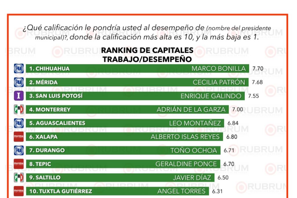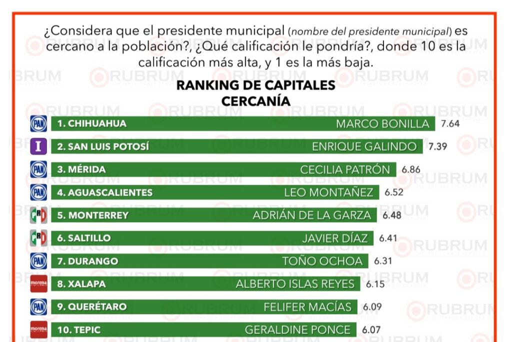 Chihuahua, Chih- La más reciente encuesta nacional de Rubrum colocó al alcalde Marco Antonio Bonilla Mendoza como el presidente municipal mejor evaluado de México, tras medir el desempeño de los ediles de las 31 capitales estatales.