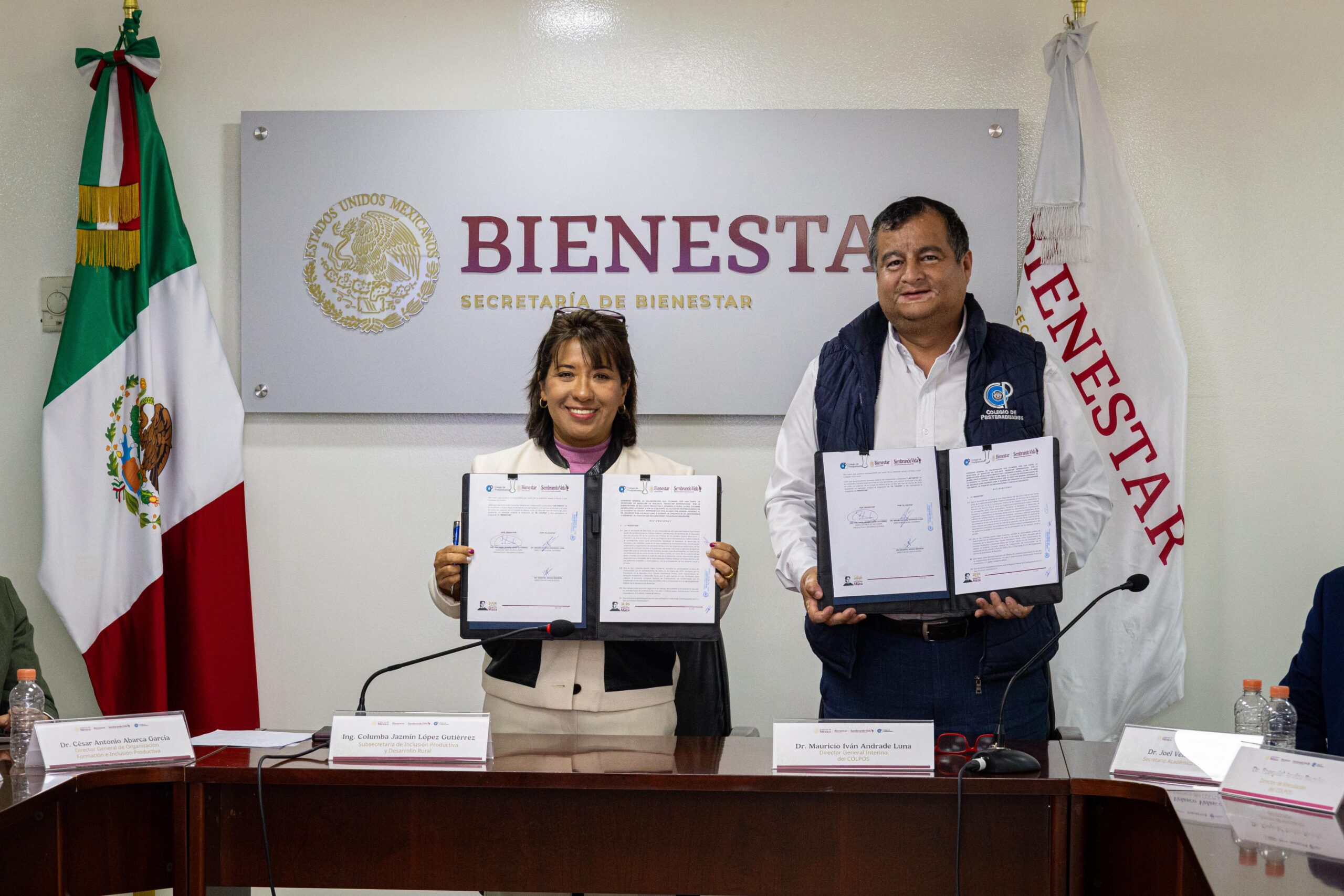 El acuerdo fue formalizado mediante la firma del director general interino del Colegio de Postgraduados, Mauricio Iván Andrade Luna, y la subsecretaria de Inclusión Productiva y Desarrollo Rural de la Secretaría de Bienestar, Columba Jazmín López Gutiérrez.