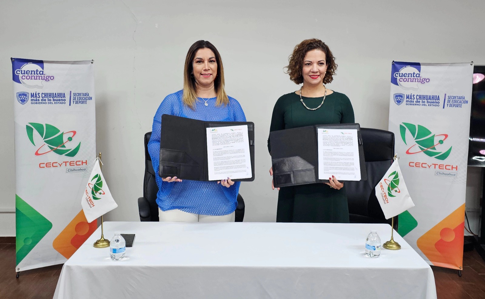 La directora general del CECyTECH, Adriana Ruiz Ramírez, y la rectora de la UTCH Sur, Luisa Yolanda Quiñones, encabezaron la firma de este convenio, reafirmando el compromiso institucional con la educación de calidad y la vinculación efectiva entre niveles educativos.