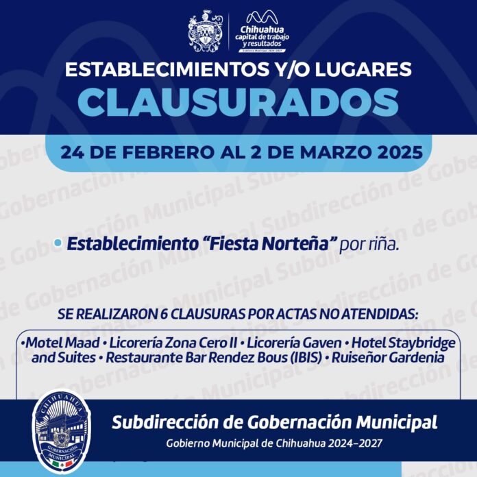 Chihuahua, Chih.- El Gobierno Municipal de Chihuahua, a través de la Subdirección de Gobernación de la Secretaría del Ayuntamiento, informa que del 24 de febrero al 3 de marzo, se realizaron 257 inspecciones a locales y establecimientos, levantaron 20 actas administrativas por diversos motivos, de las cuales siete fueron.