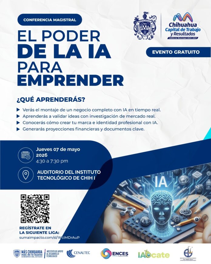 H. Ciudad de Chihuahua, Chih., a 28 de abril de 2026.- Con el objetivo de acercar herramientas tecnológicas al ecosistema emprendedor, el Gobierno Municipal de Chihuahua, a través de la Dirección de Desarrollo Económico y Competitividad, invita a la conferencia magistral “El Poder de la IA para Emprender”.