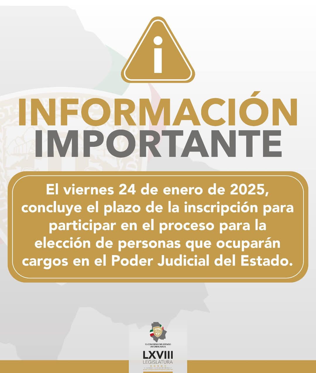 Las personas aspirantes se inscribirán ante los Comités de Evaluación de cada Poder del Estado, hasta el viernes 24 de enero a las 23:59 horas del 2025 a través del sitio web: https://www.congresochihuahua.gob.mx/micrositio/personasjuzgadoras/2025.