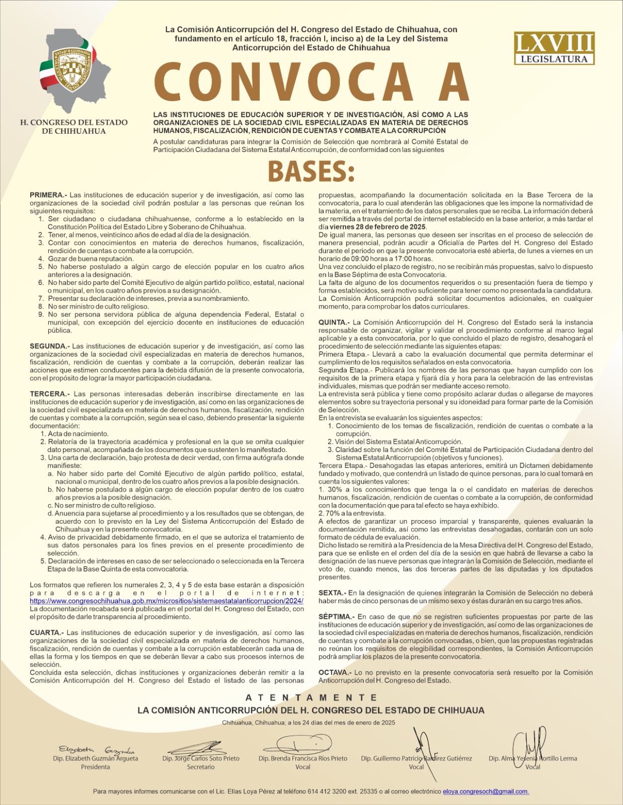 El Congreso del Estado de Chihuahua invita a la sociedad a integrar la Comisión de Selección, responsable de designar al Comité Estatal de Participación Ciudadana del Sistema Estatal Anticorrupción, mediante un proceso integral, efectivo y transparente en el que la sociedad organizada y la academia sean parte.