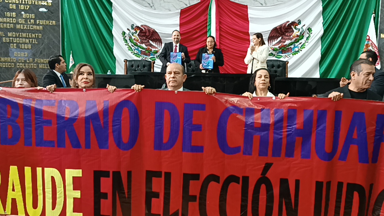 Durante la entrega del informe, los integrantes de la bancada de Morena subieron a la tribuna exhibiendo una lona en la que señalaban un fraude en la elección judicial.