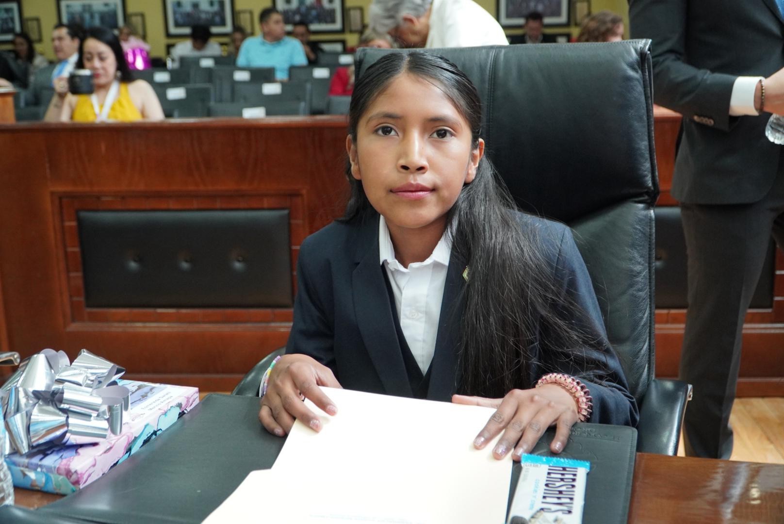La pequeña, diputada infantil representante del diputado del PRI José Luis Villalobos, y quie. asiste a la escuela primaria comunitaria Tecorahui, señaló que le gusta mucho ir a la escuela y aprender cosas nuevas todos los días.