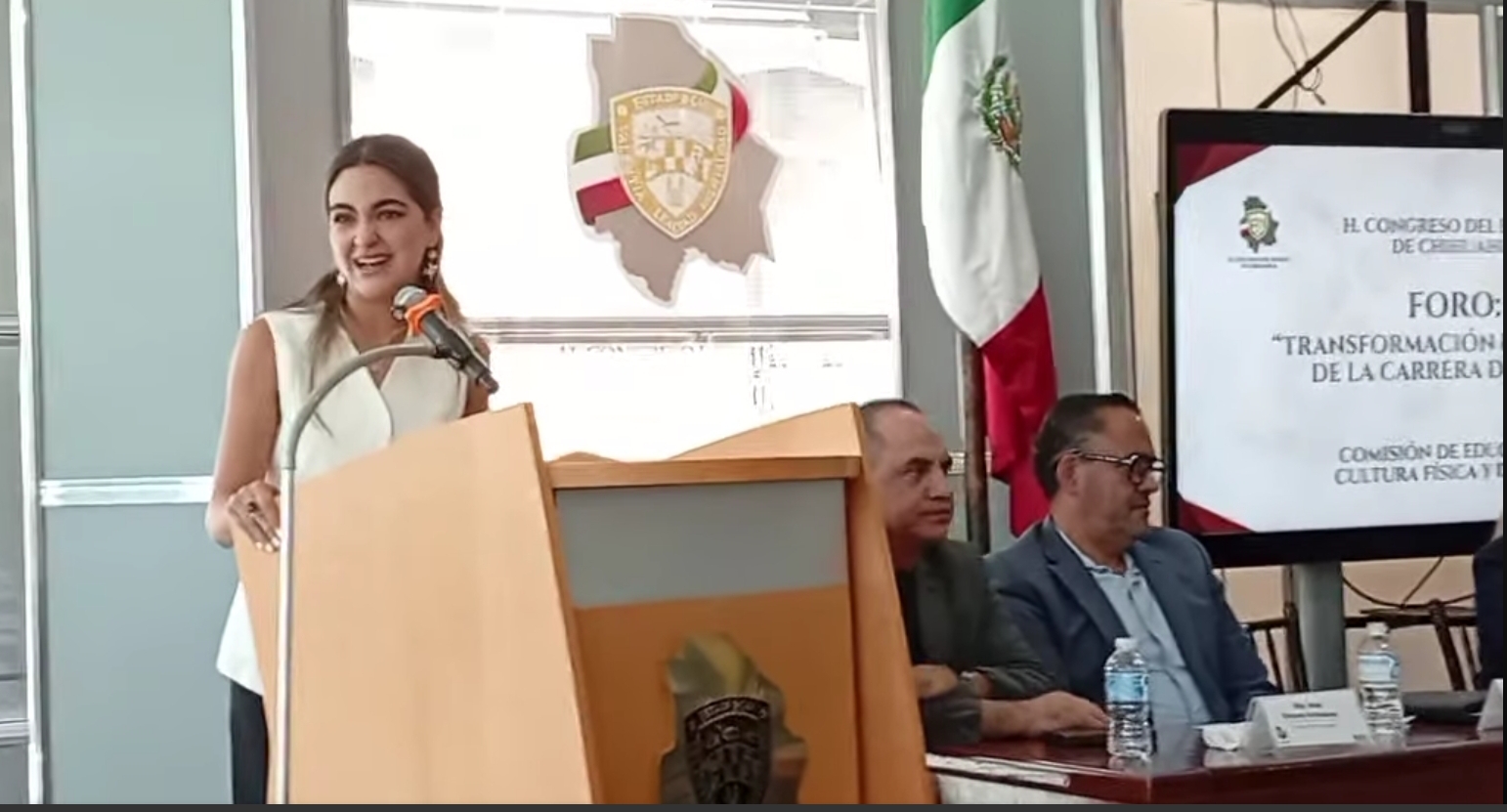 “Es motivo de muchísimo orgullo estar aquí, entre familias, porque yo soy hija de maestra y maestro. Conozco desde dentro la entrega, el sacrificio y el compromiso que implica ejercer la docencia en México”, expresó la legisladora al iniciar su participación, acompañada por docentes, representantes sindicales y autoridades legislativas.