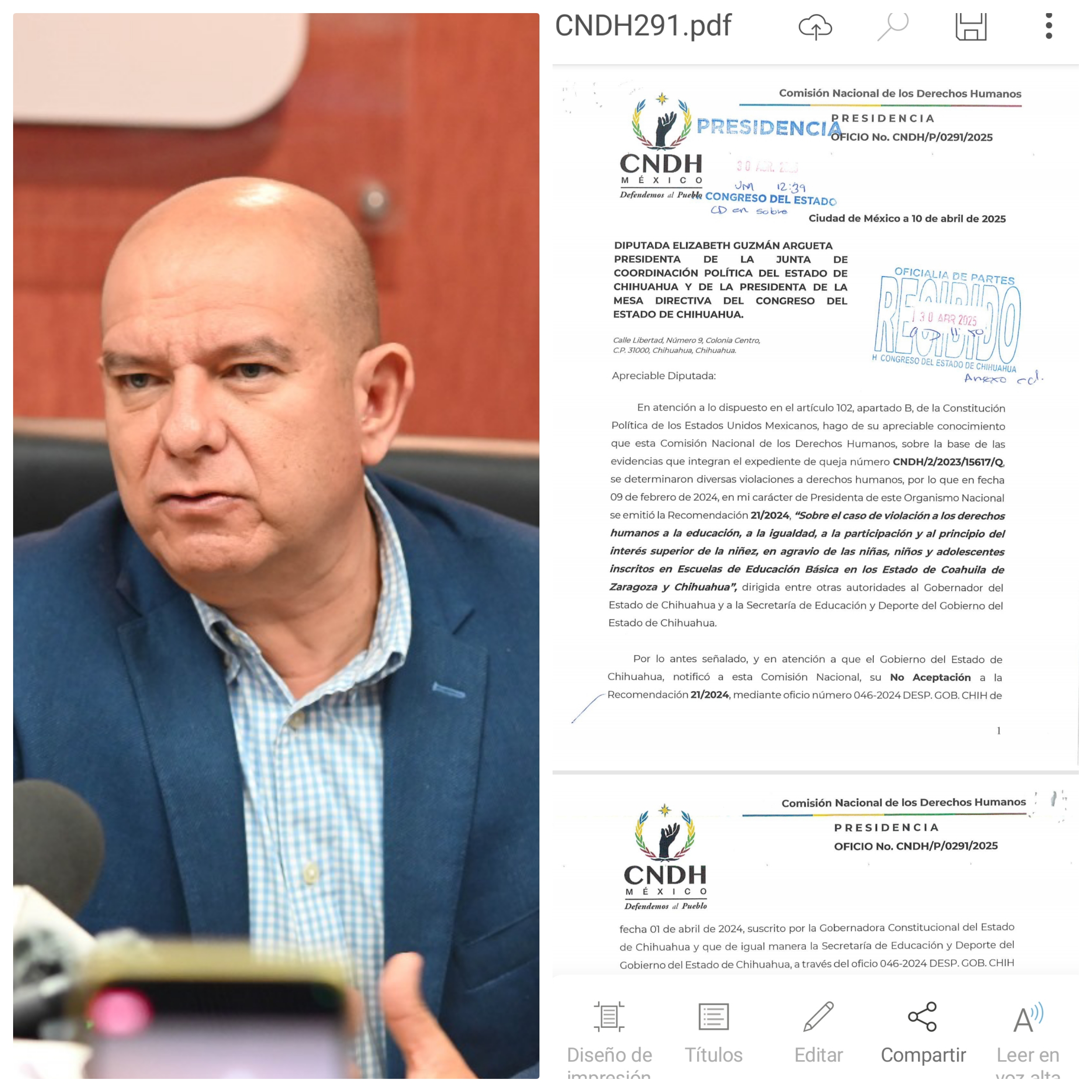 El legislador recordó que la Controversia Constitucional presentada por parte del Gobierno del Estado de Chihuahua fue desechada por la Suprema Corte de Justicia, mientras que la CNDH emitió una recomendación, la 21/2024, sin embargo la mencionada recomendación no fue aceptada por las autoridades estatales.
