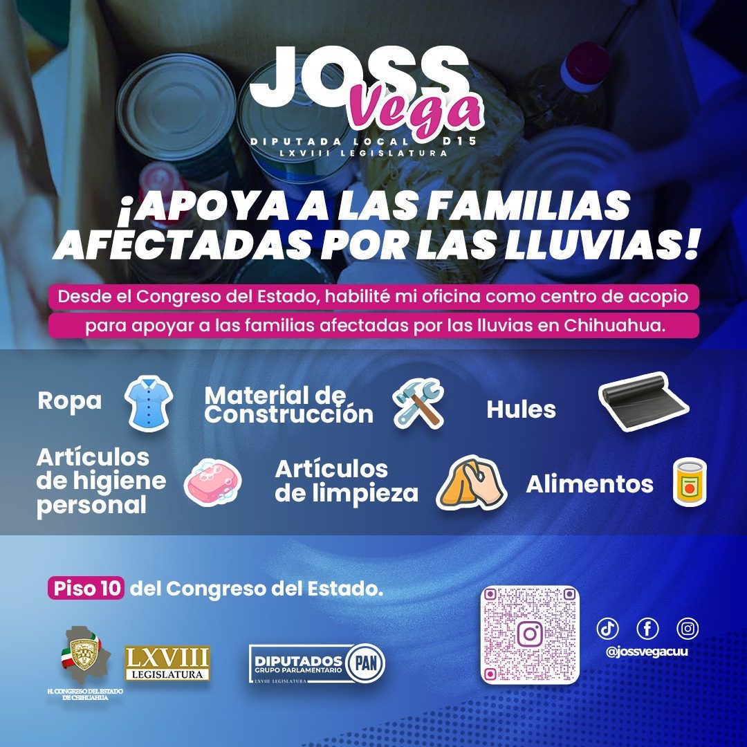 Chihuahua, Chih.- La diputada por el Partido Acción Nacional (PAN), Joceline ‘Joss’ Vega dio a conocer que su oficina, ubicada en el piso 10 del Congreso del Estado, estará habilitada como centro de acopio para apoyar a las personas que resultaron damnificadas por las lluvias que han azotado a la capital durante esta semana.