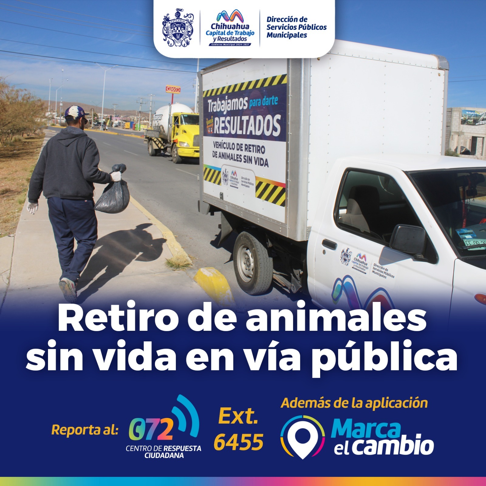 H. Ciudad de Chihuahua, Chih.- El Gobierno Municipal, a través de la Dirección de Servicios Públicos, trabaja de forma permanente en el retiro de animales sin vida de la vía pública, en atención a reportes ciudadanos.