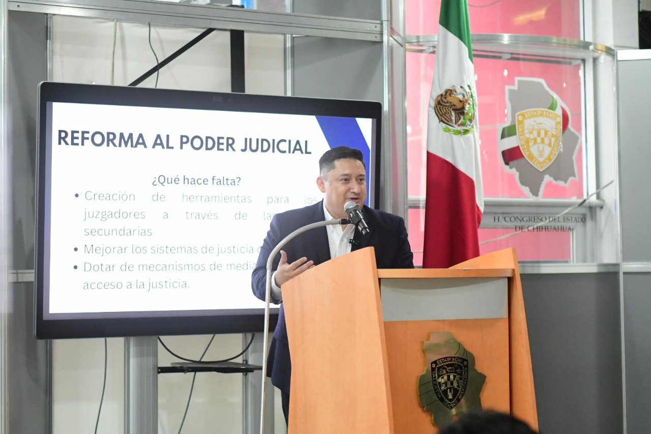 La presidenta del Capítulo Chihuahua, Yazmín Alejandra Rivera Castillo, fue la encargada de dar la bienvenida y presentar al legislador, quien posteriormente inició su intervención con un análisis sobre las reformas más recientes en la agenda pública nacional y estatal.