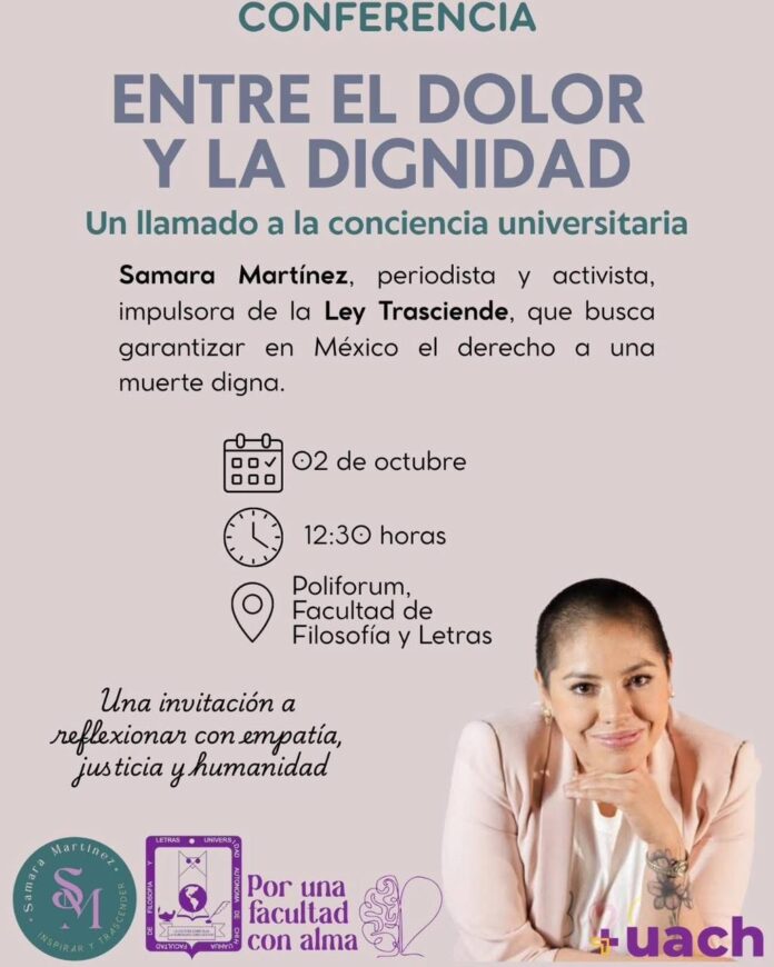 La Facultad de Filosofía y Letras de la Universidad Autónoma de Chihuahua invita a la comunidad universitaria y al público en general a la conferencia “Entre el dolor y la dignidad: un llamado a la conciencia universitaria”, que impartirá la periodista, activista y egresada de esta facultad Samara Martínez, el próximo 2 de octubre a las 12:30 horas en el Poliforum de la Facultad.