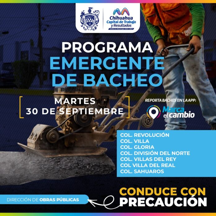 Chihuahua, Chih.- El Gobierno Municipal, a través de la Dirección de Obras Públicas, trabajará con bacheo este 30 de septiembre, mediante el programa emergente, en las colonias Revolución, Villa, Gloria, División del Norte, Villas del Rey, Villa del Real y Sahuaros.