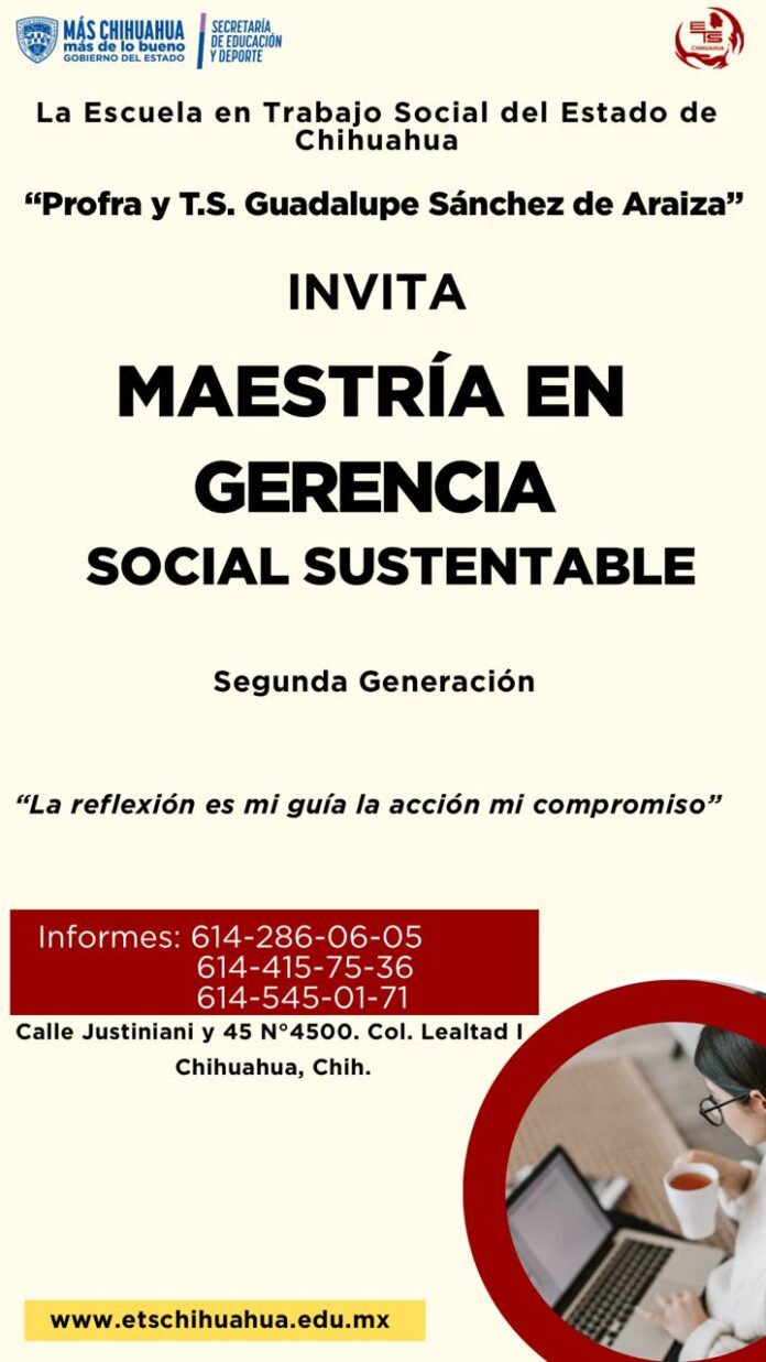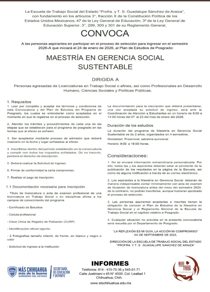 La Escuela de Trabajo Social del Estado de Chihuahua “Profra. y T.S. Guadalupe Sánchez de Araiza” anunció la apertura de inscripciones para la segunda generación de la Maestría en Gerencia Social Sustentable, programa académico que dará inicio en enero de 2026.