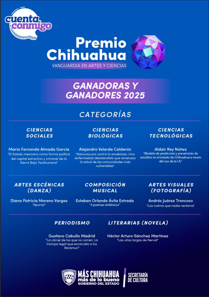 El Gobierno del Estado, a través de la Secretaría de Cultura, anunció los nombres de las y los ganadores del Premio Chihuahua Vanguardia en Artes y Ciencias 2025.