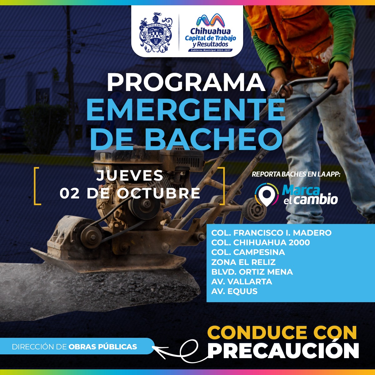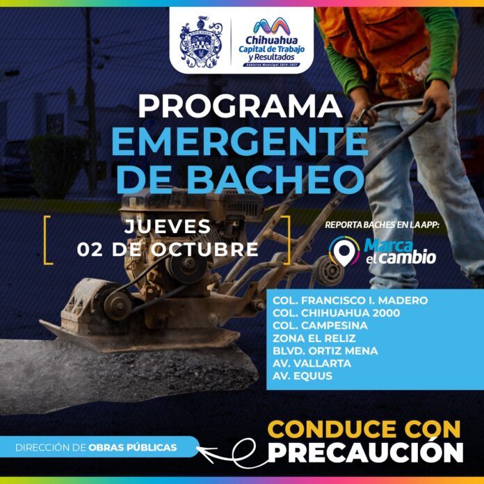 Chihuahua, Chih.- El Gobierno Municipal, a través de la Dirección de Obras Públicas, trabajará con bacheo este 2 de octubre, mediante el programa emergente, en las colonias Francisco I. Madero, Chihuahua 2000, Campesina y en la zona de El Reliz, así como en el boulevard Ortiz Mena y en las avenidas Vallarta y Equus.