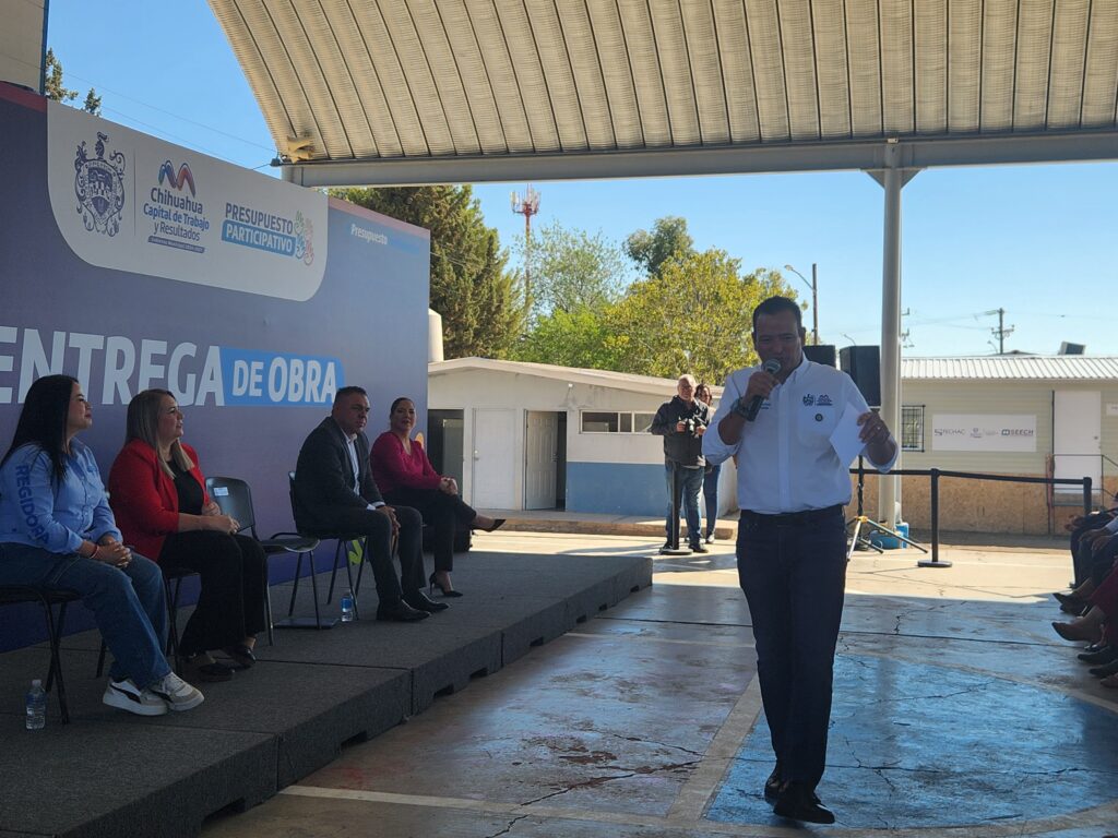 Chihuahua, Chih.- El alcalde Marco Bonilla inauguró la rehabilitación de diversos espacios en la secundaria 3046, obra que se realizó gracias al Presupuesto Participativo 2024 y que beneficiará a más de mil 120 estudiantes de los turnos matutino y vespertino.