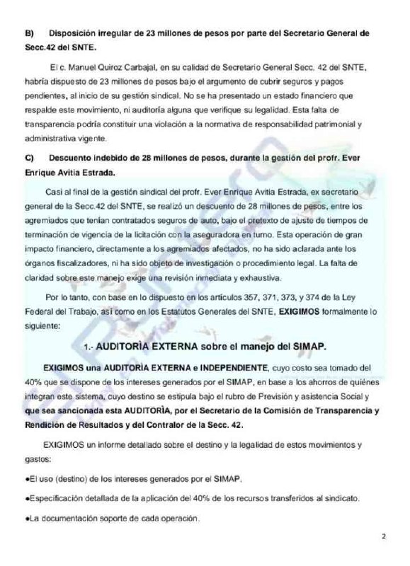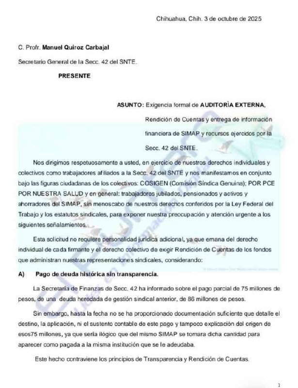 ASUNTO: Exigencia formal de AUDITORÌA EXTERNA, Rendición de Cuentas y entrega de información financiera de SIMAP y recursos ejercidos por la Secc. 42 del SNTE.