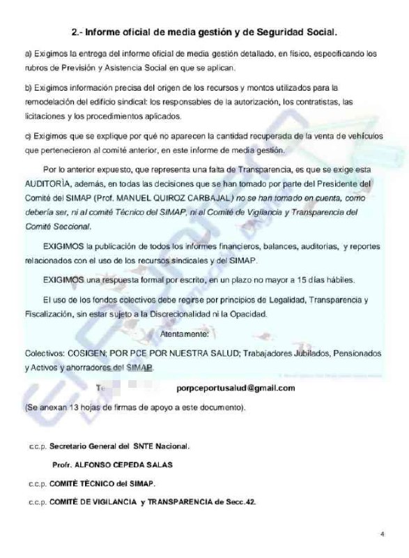 Este viernes, los colectivos COSIGEN (Comisión Síndica Genuina) «Por PCE Por Nuestra Salud» y en general trabajadores jubilados, pensionados y activos y ahorradores del SIMAP hicieron entrega de un oficio, avalado por más de mil firmas, a través del que exigen de manera formal al secretario general de la Sección 42 del SNTE, Manuel Quiroz Carbajal, una auditoría externa, rendición de cuentas y entrega de información financiera de SIMAP y recursos ejercidos por la Sección 42 del SNTE, haciendo referencia a varios señalamientos relacionados con el manejo de recursos. Asimismo en el documento, con acuse de recibo al secretario general del SNTE Nacional, Alfonso Cepeda Salas, y el Comité de Vigilancia -cuyo contenido se comparte a continuación- también exigen al secretario general y todo su Comité Ejecutivo un informe de media gestión.