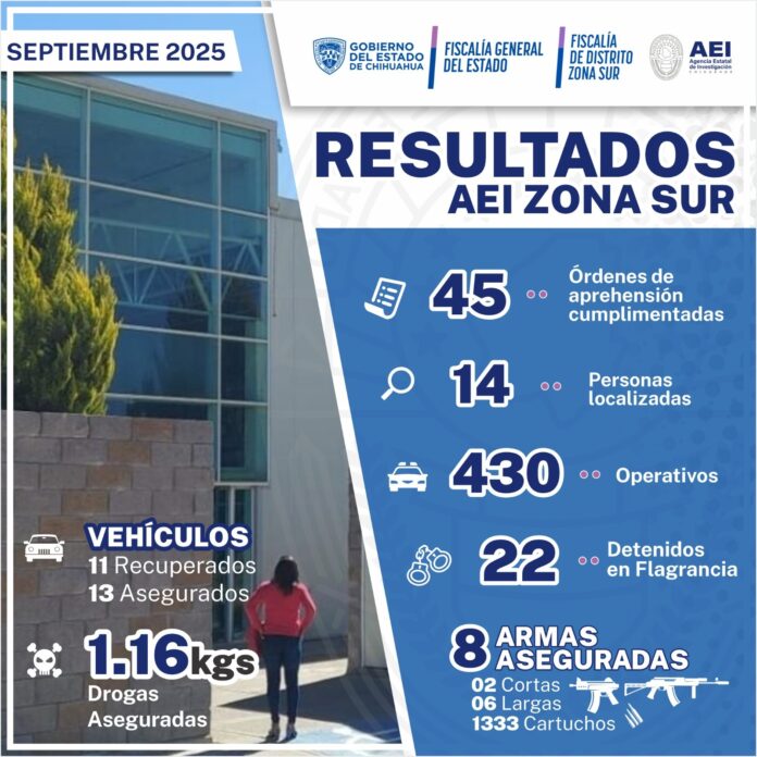 530 operativos, 8 armas y 1,333 cartuchos asegurados y 11 vehículos recuperados, entre resultados de Fiscalía Zona Sur en septiembre
