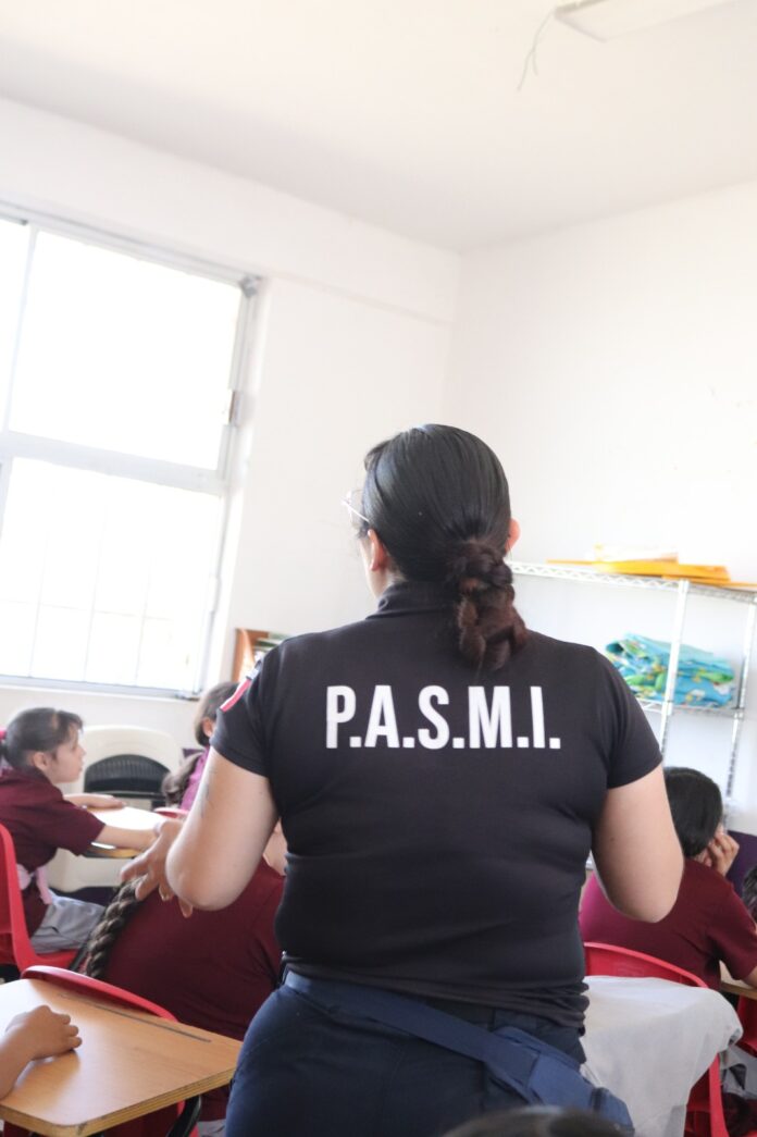 Cuauhtémoc, Chih.- Con el objetivo de fomentar entornos escolares seguros y promover el respeto entre niñas y niños, padres de familia y docentes, personal de la Unidad PASMI (Prevención al Abuso Sexual y Maltrato Infantil) de la Dirección de Seguridad Pública Municipal impartió una jornada de prevención en la escuela Primaria Bicentenario, ubicada en la colonia El Mirador.