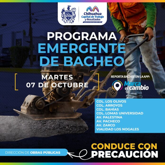 H. Ciudad de Chihuahua, Chih.– El Gobierno Municipal, a través de la Dirección de Obras Públicas, realizará trabajos de bacheo este 7 de octubre, mediante el programa emergente en calles de las colonias Los Olivos, Arroyos, Bahías, Lomas Universidad, así como en las avenidas Palestina, Pacheco, Zarco y en la Vialidad Los Nogales.