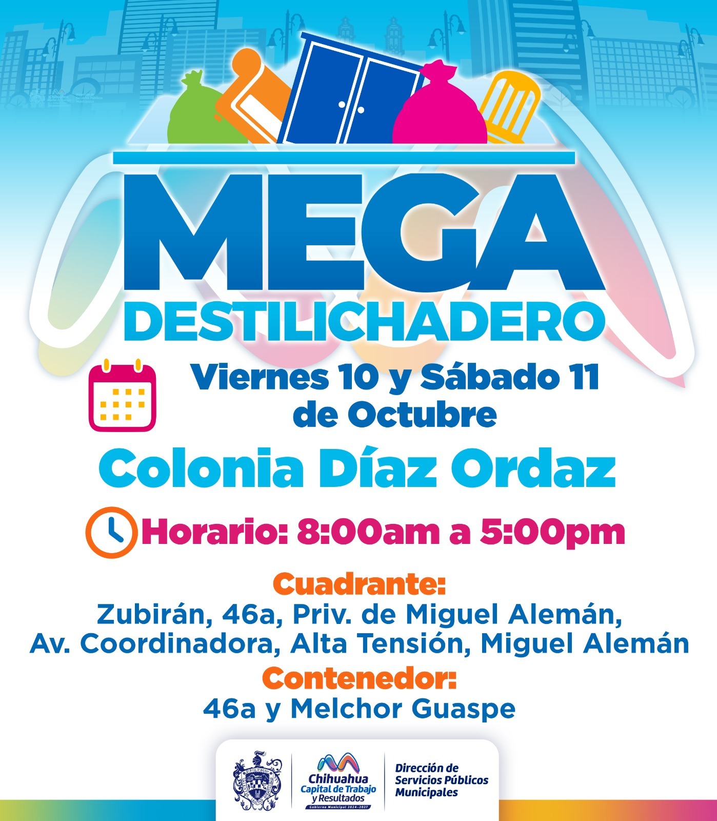 H. Ciudad de Chihuahua, Chih.– Con el objetivo de evitar acumulación de tiliches en la vía pública, así como en las viviendas, el Gobierno Municipal, a través de la Dirección de Servicios Públicos Municipales, llevará un Mega Destilichadero a la colonia Díaz Ordaz este próximo viernes 10 y sábado 11 de octubre.