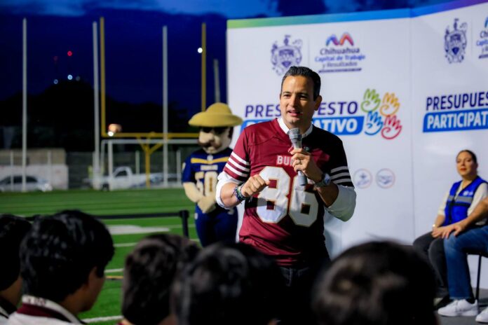 H. Ciudad de Chihuahua, Chih.– El alcalde de Chihuahua, Marco Bonilla, hizo entrega de las graderías y luminarias instaladas en la cancha de futbol americano del Centro de Estudios Tecnológicos Industrial y de Servicios número 86 (CETIS), un proyecto impulsado por la propia comunidad estudiantil para que ganara la consulta del Presupuesto Participativo 2025, con más de 3 mil votos a favor.