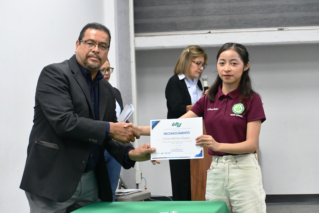 La Universidad Tecnológica de Ciudad Juárez (UTCJ) llevó a cabo la entrega de reconocimientos a estudiantes con los mejores promedios de las carreras de Mecatrónica y Energías Renovables, tanto del turno matutino como vespertino, así como docentes, por ser los mejores evaluados por su destacada labor académica y compromiso con la formación integral del alumnado.