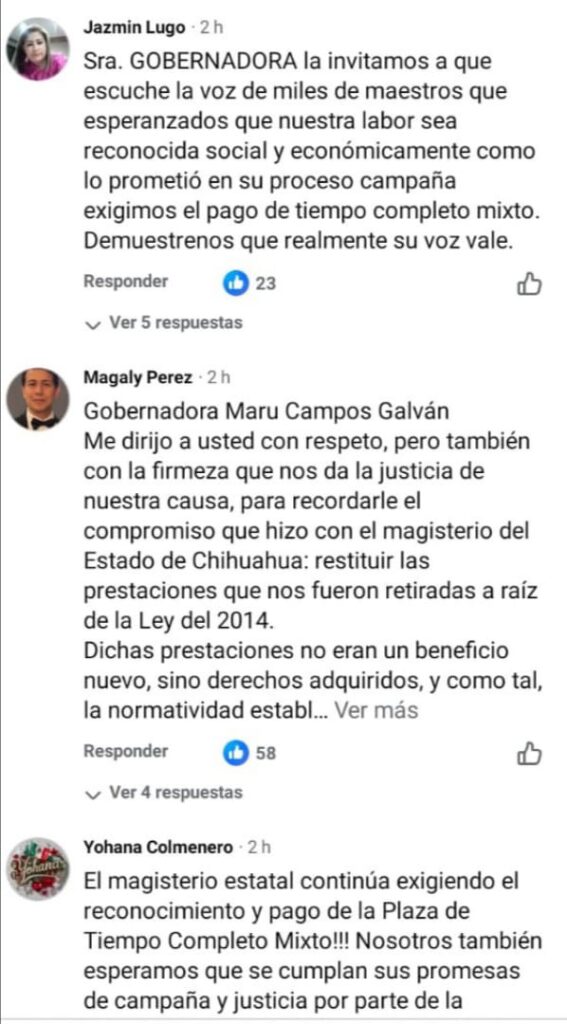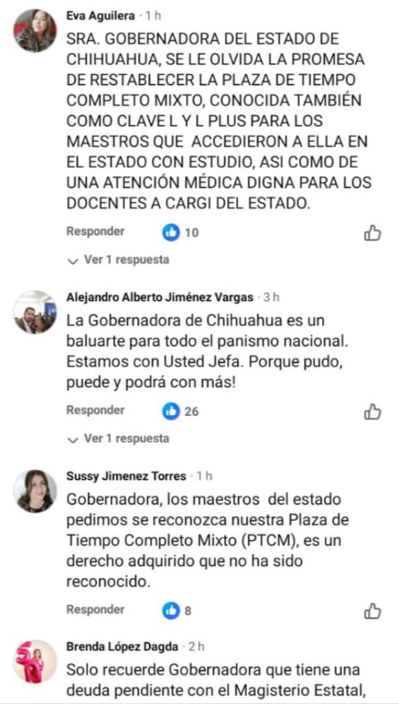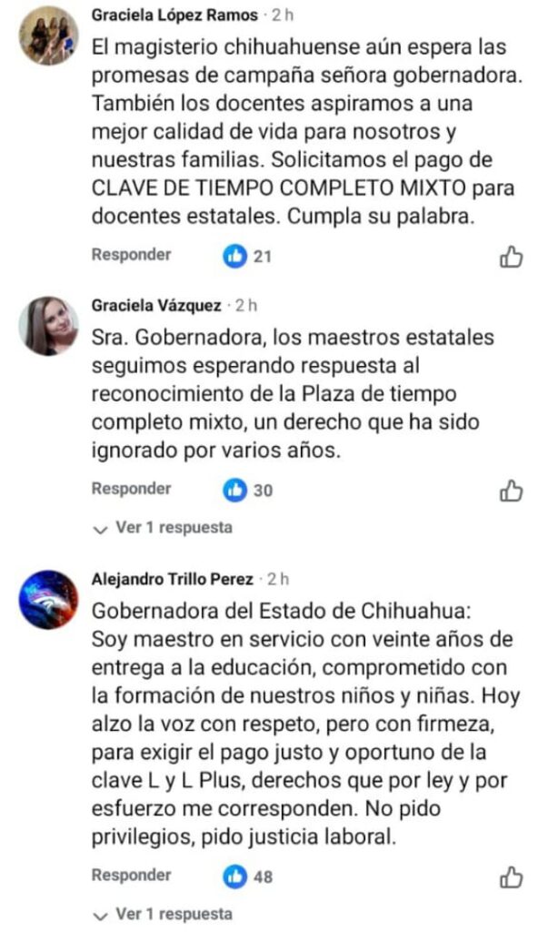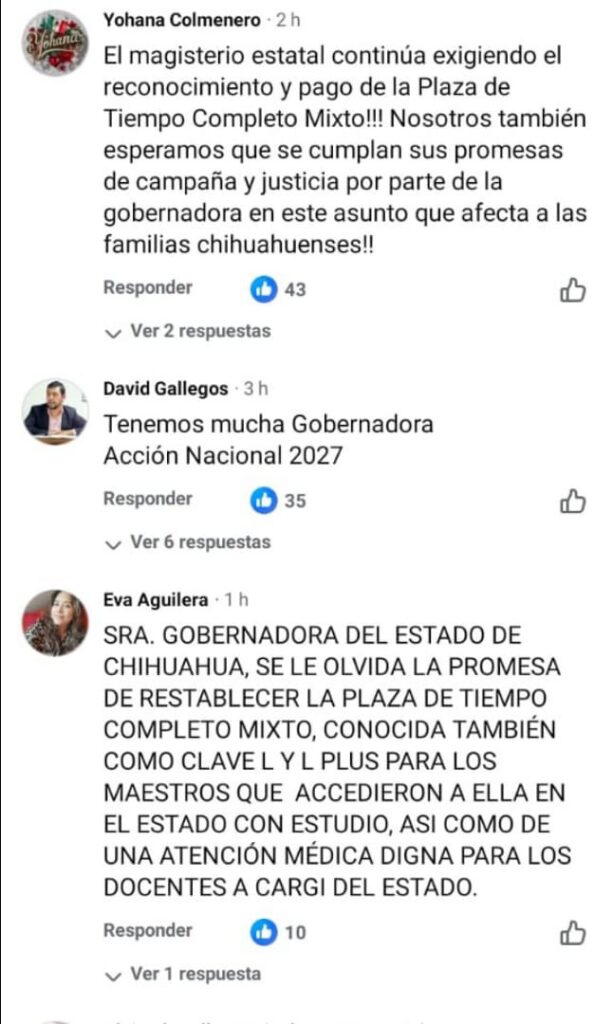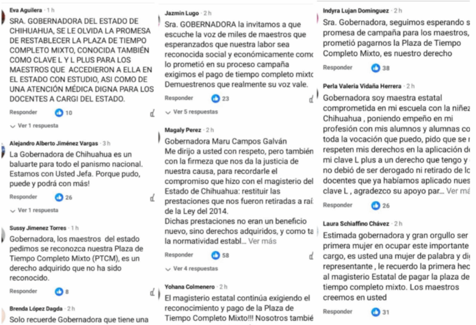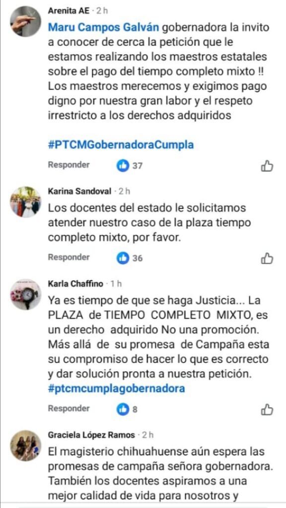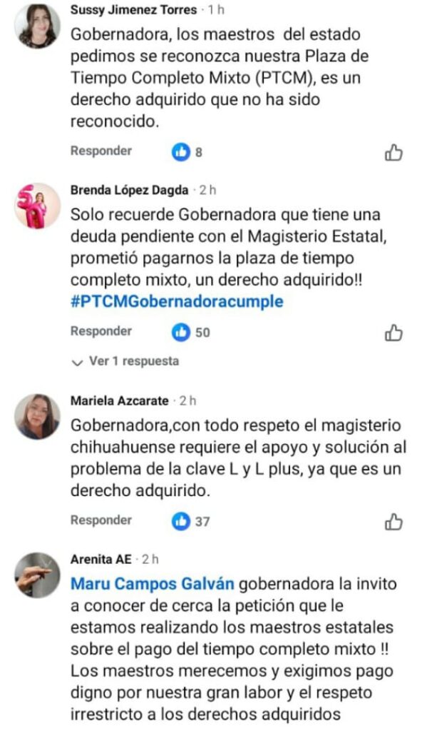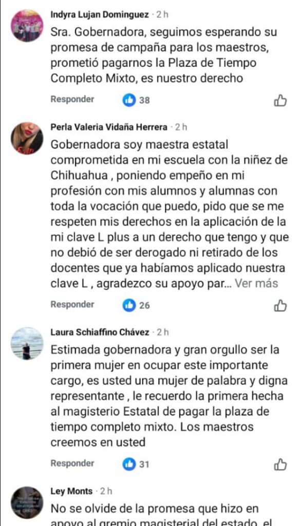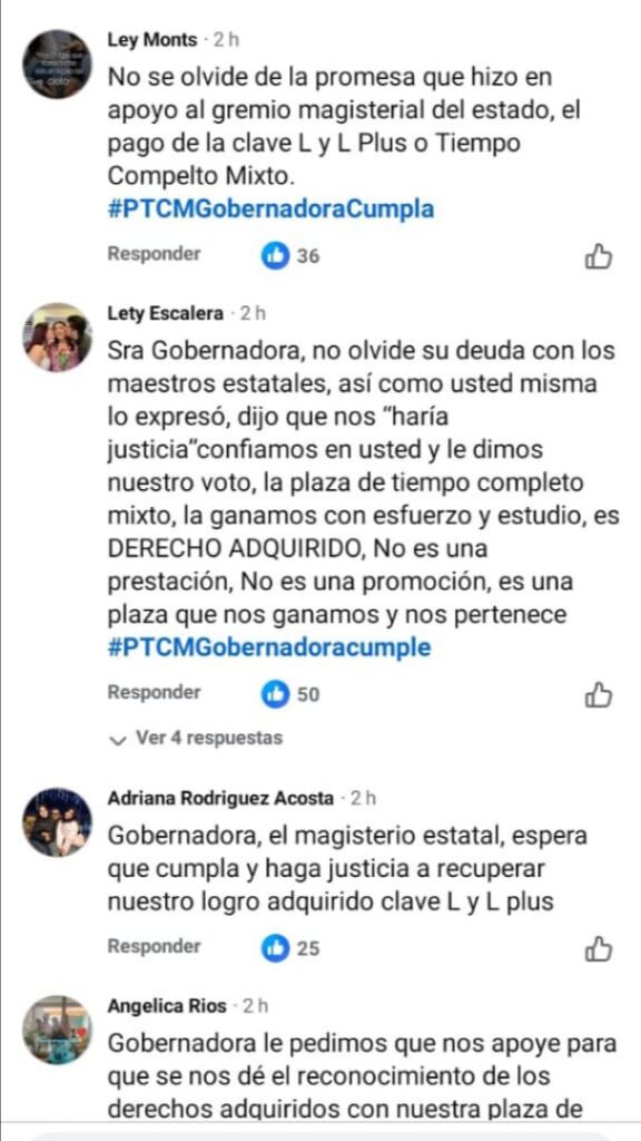 A continuación algunos de los mensajes que maestras y maestros estatales afectados por esta problemática de la Plaza de Tiempo Completo Mixto, que dejó de pagarse desde 2015 -por lo que sostienen fue una interpretación interesada por parte de Gobierno del Estado a la entrada en vigor de la Ley General del Servicio Profesional Docente- compartieron dirigidos a la gobernadora en su propia publicación: