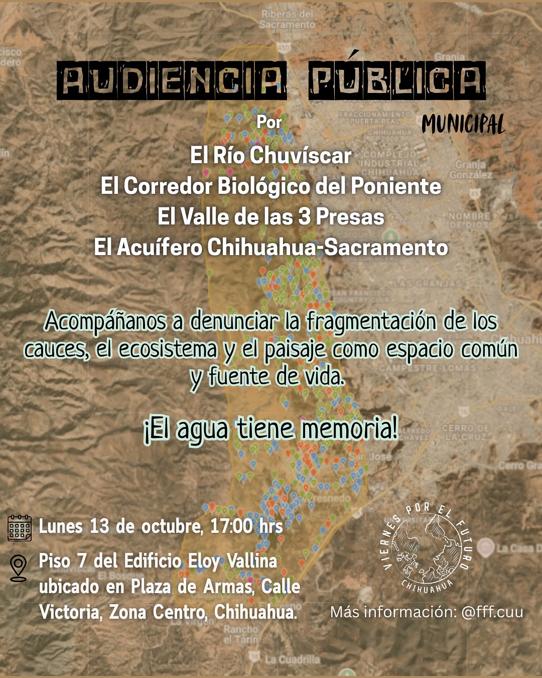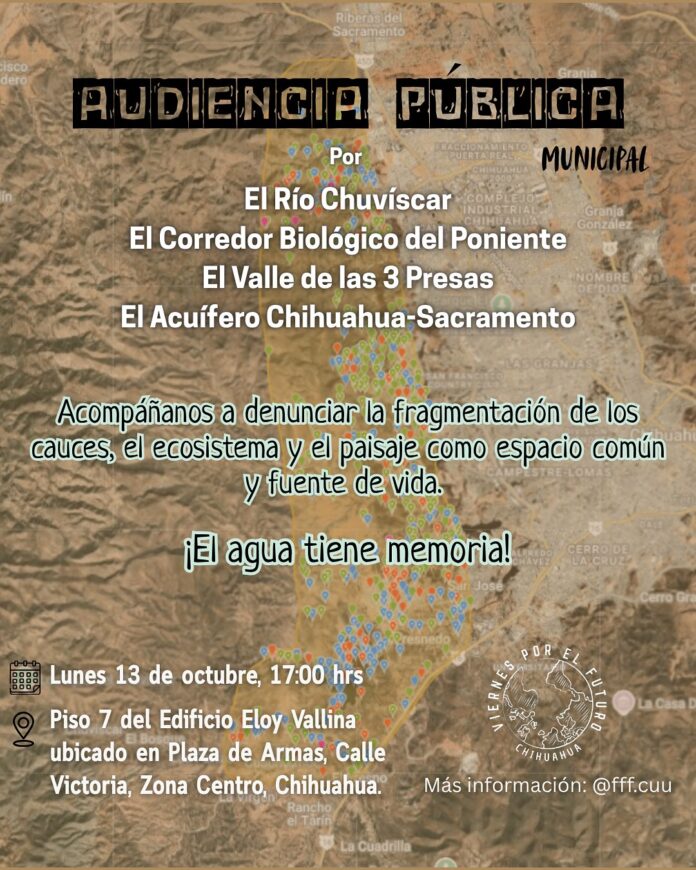 Chihuahua, Chih.- Integrantes del colectivo Viernes por el Futuro Chihuahua sostendrán este lunes una audiencia pública con autoridades municipales para abordar las afectaciones ambientales derivadas del proyecto vial Poniente 5, el cual atraviesa una zona considerada corredor biológico y área de recarga del acuífero Chihuahua–Sacramento.