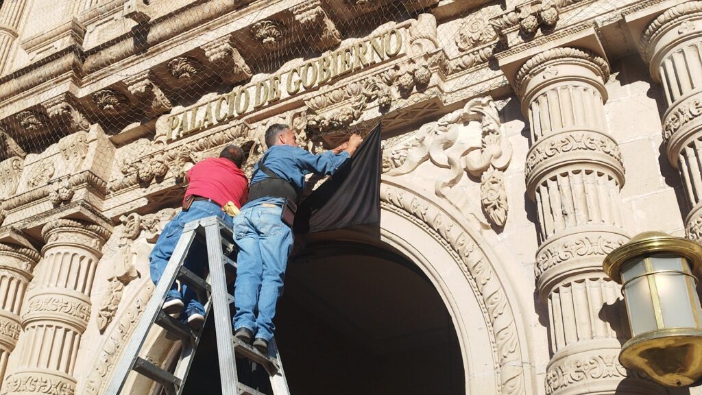 A una semana y un día de su fallecimiento, la mañana de este lunes fueron colocados sendos moños negros las puertas de acceso a Palacio de Gobierno en señal de luto por el deceso del empresario Víctor Manuel Cruz Russek, esposo de la gobernadora Maru Campos Galván.