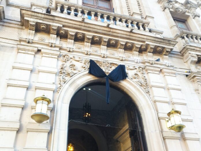En primer lugar, operarios de la administración estatal colocaron un gran moño negro sobre la puerta de la calle Libertad y posteriormente hicieron lo mismo en la puerta de la calle Aldama.
