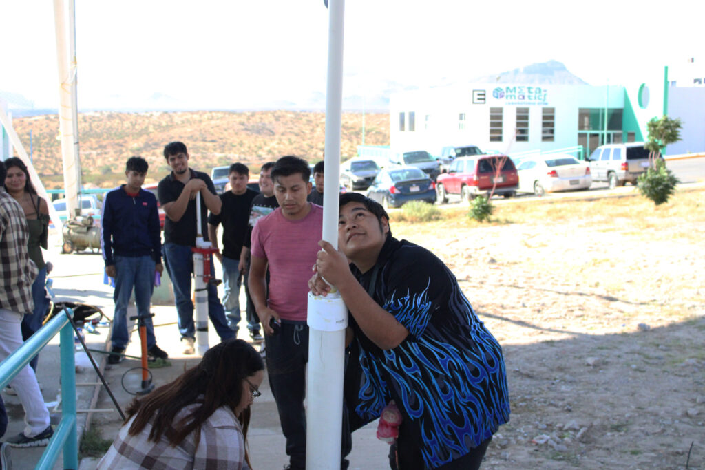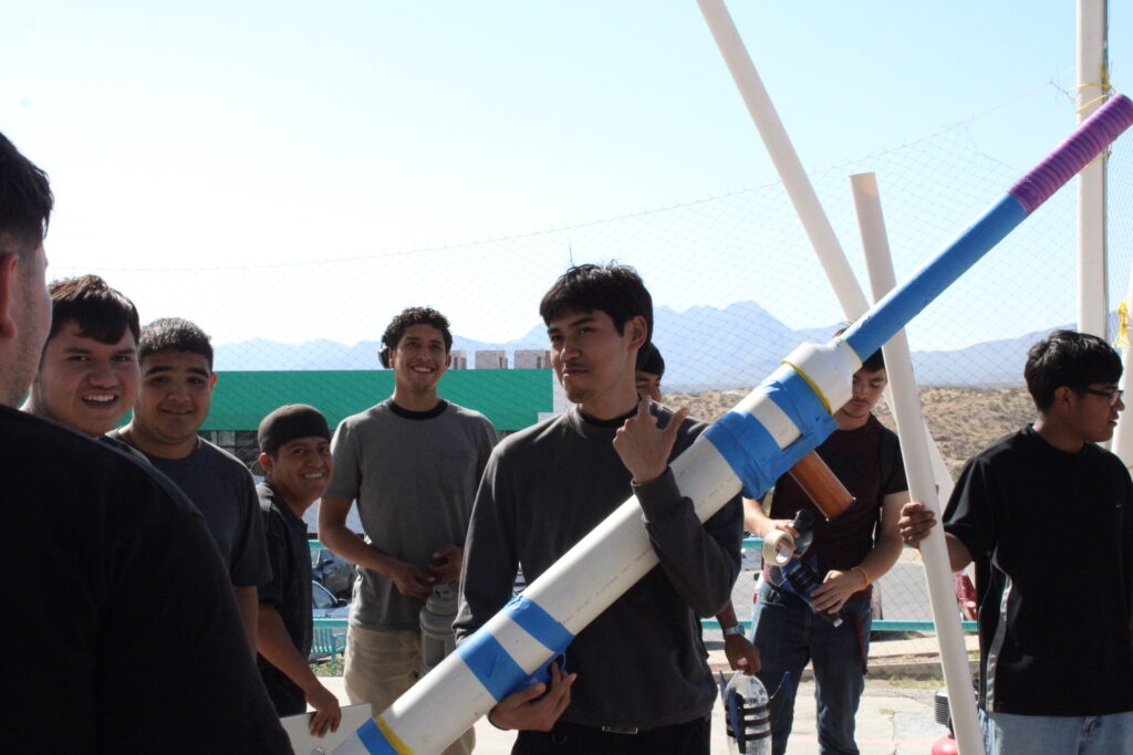 Estudiantes de la carrera de Ingeniería en Mecatrónica de la Universidad Tecnológica Paso del Norte (UTPN), realizaron una prueba de lanzamiento de cohetes de aire como parte de la asignatura de Instrumentación Industrial.