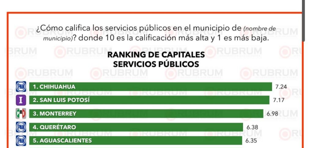 En servicios públicos, Chihuahua Capital también encabezó el ranking nacional con 7.24, superando a San Luis Potosí (7.17) y Monterrey (6.98).