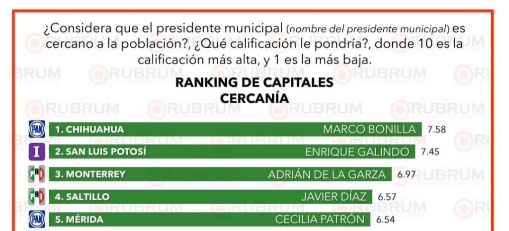 En la categoría de cercanía con la ciudadanía, el alcalde de Chihuahua obtuvo una calificación de 7.58, ubicándose nuevamente en el primer lugar, seguido de San Luis Potosí (7.45) y Monterrey (6.97).