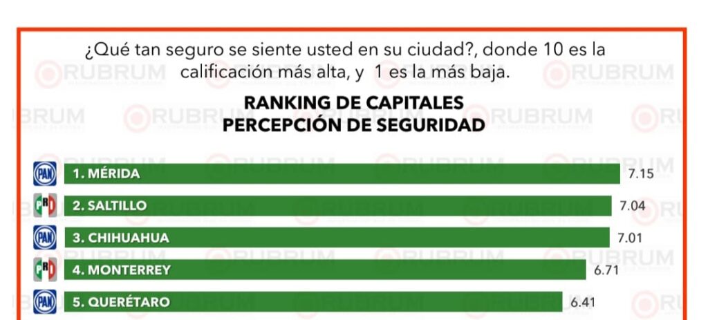 En cuanto a percepción de seguridad, Chihuahua se colocó en la tercera posición nacional con 7.04 puntos, solo detrás de Mérida (7.15) y Saltillo (7.07), de acuerdo con el mismo estudio.