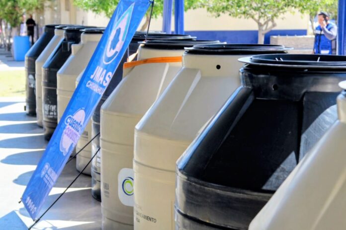 El director ejecutivo de la Junta Municipal de Agua y Saneamiento (JMAS) de Chihuahua, Alan Falomir, encabezó la donación de 12 tinacos a escuelas primarias ubicadas en el norte de la capital.