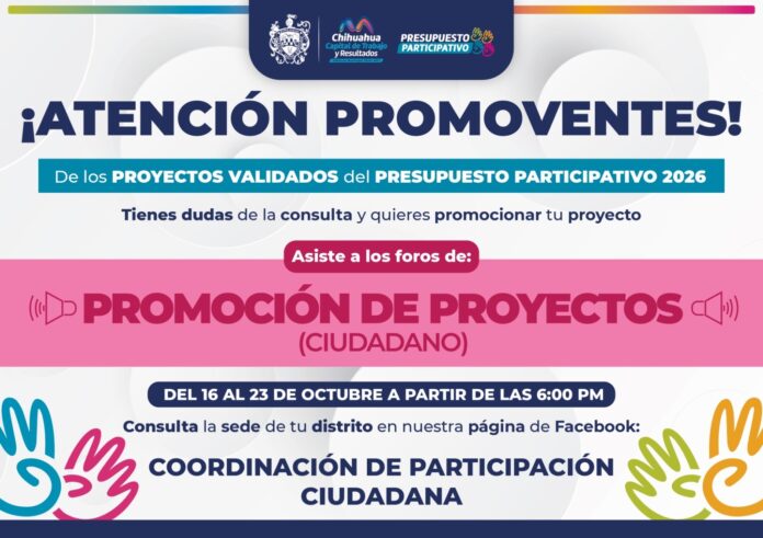 H. Ciudad de Chihuahua, Chih.- El Gobierno Municipal, a través de la Coordinación de Participación Ciudadana, invita promoventes que probaron sus propuestas para el “Presupuesto Participativo 2026”, a asistir a los Foros de Promoción de Proyectos.