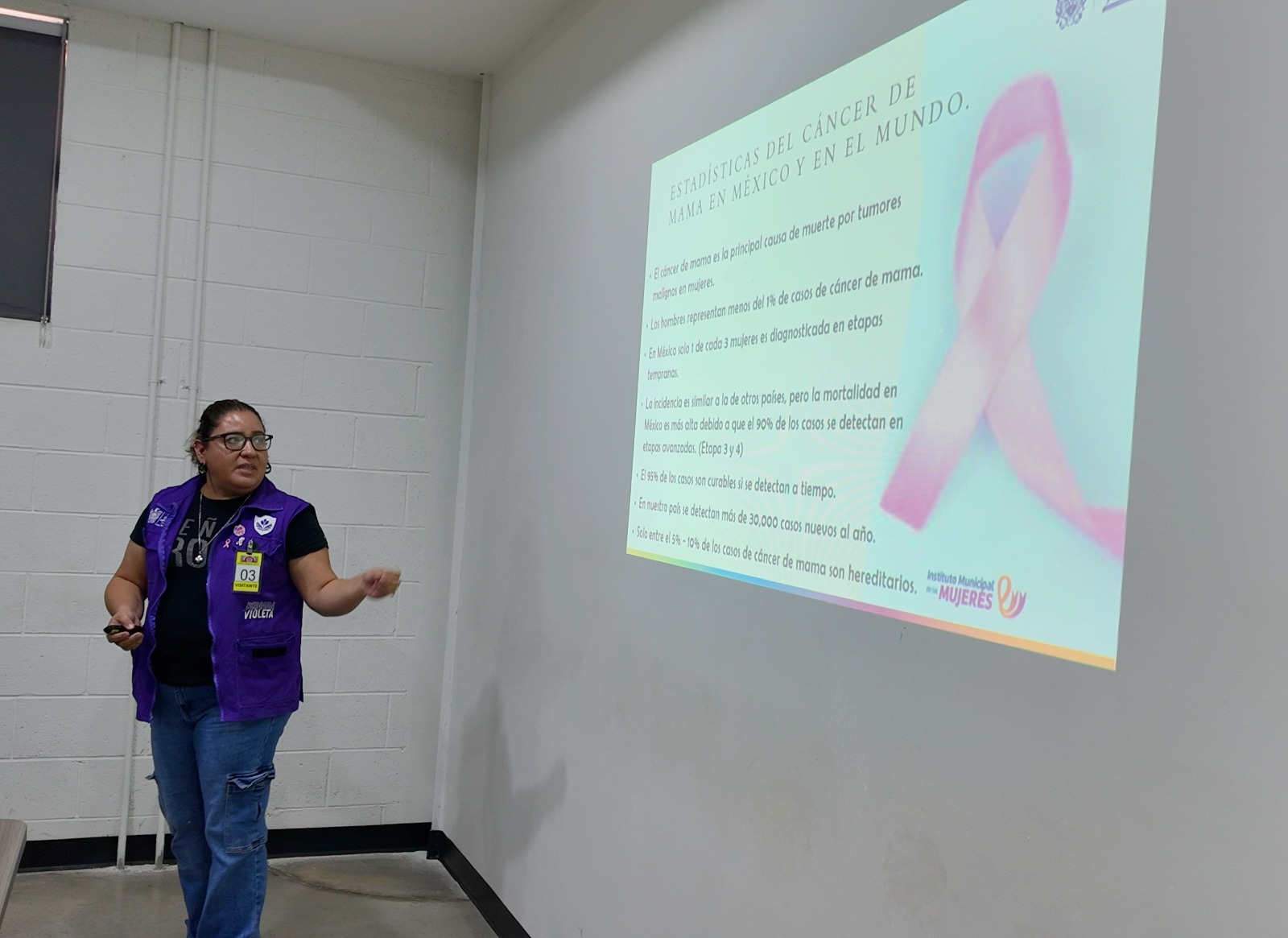 Durante estas sesiones, personal del IMM compartió información sobre la importancia de la autoexploración mamaria, los factores de riesgo, así como los servicios gratuitos de orientación y canalización médica a las mujeres que lo requieran.